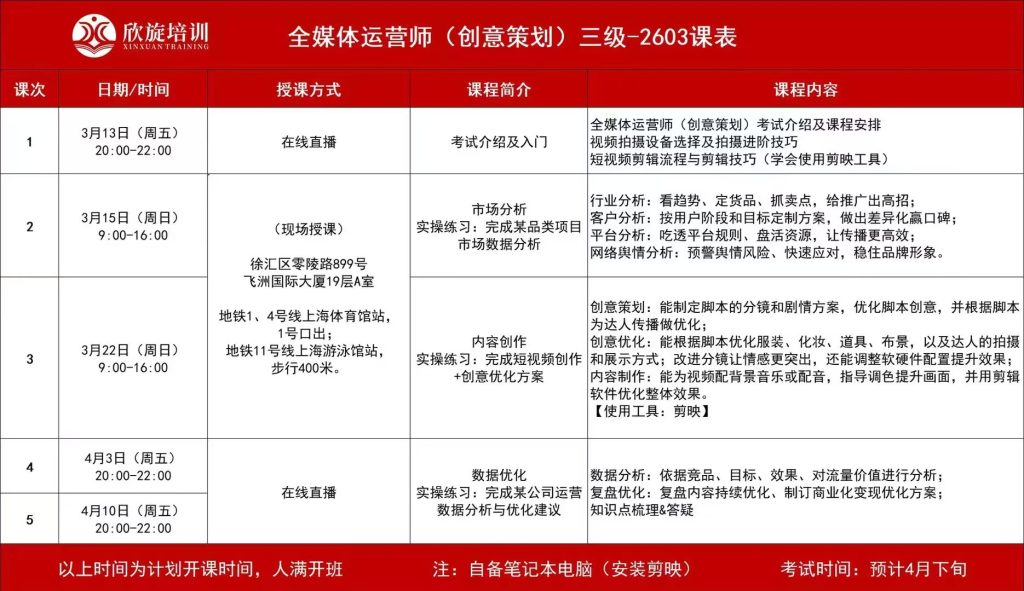2026年3月课程安排丨全媒体运营师(创意策划)三级
