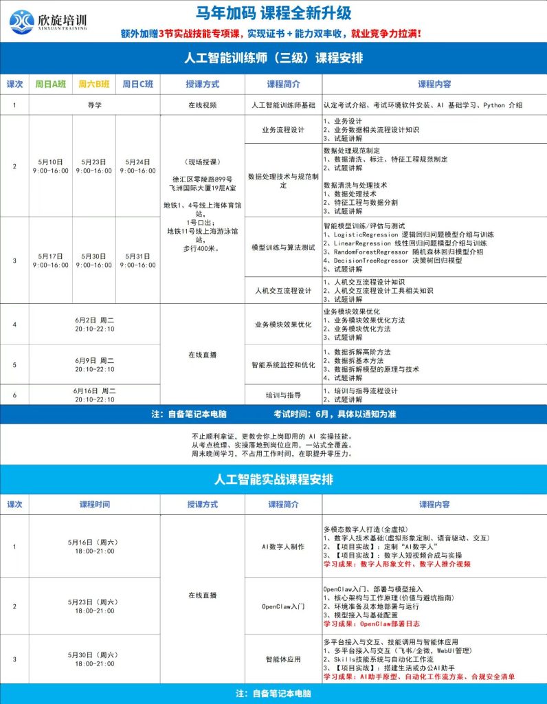 2026年5月课程安排丨学人工智能训练师送AI实战课